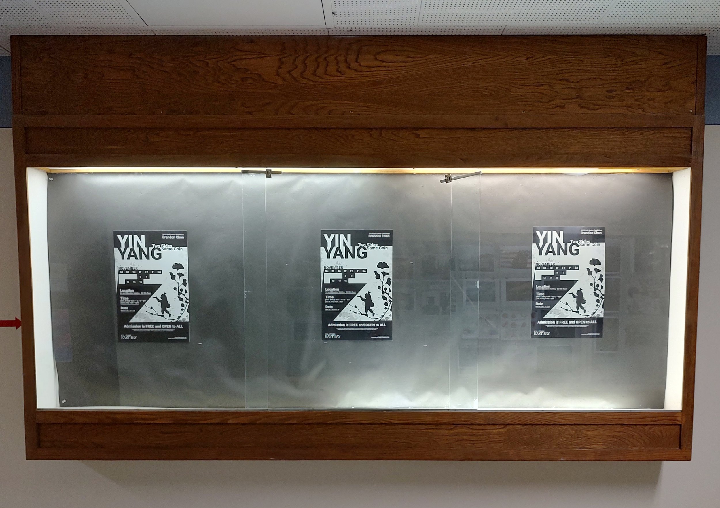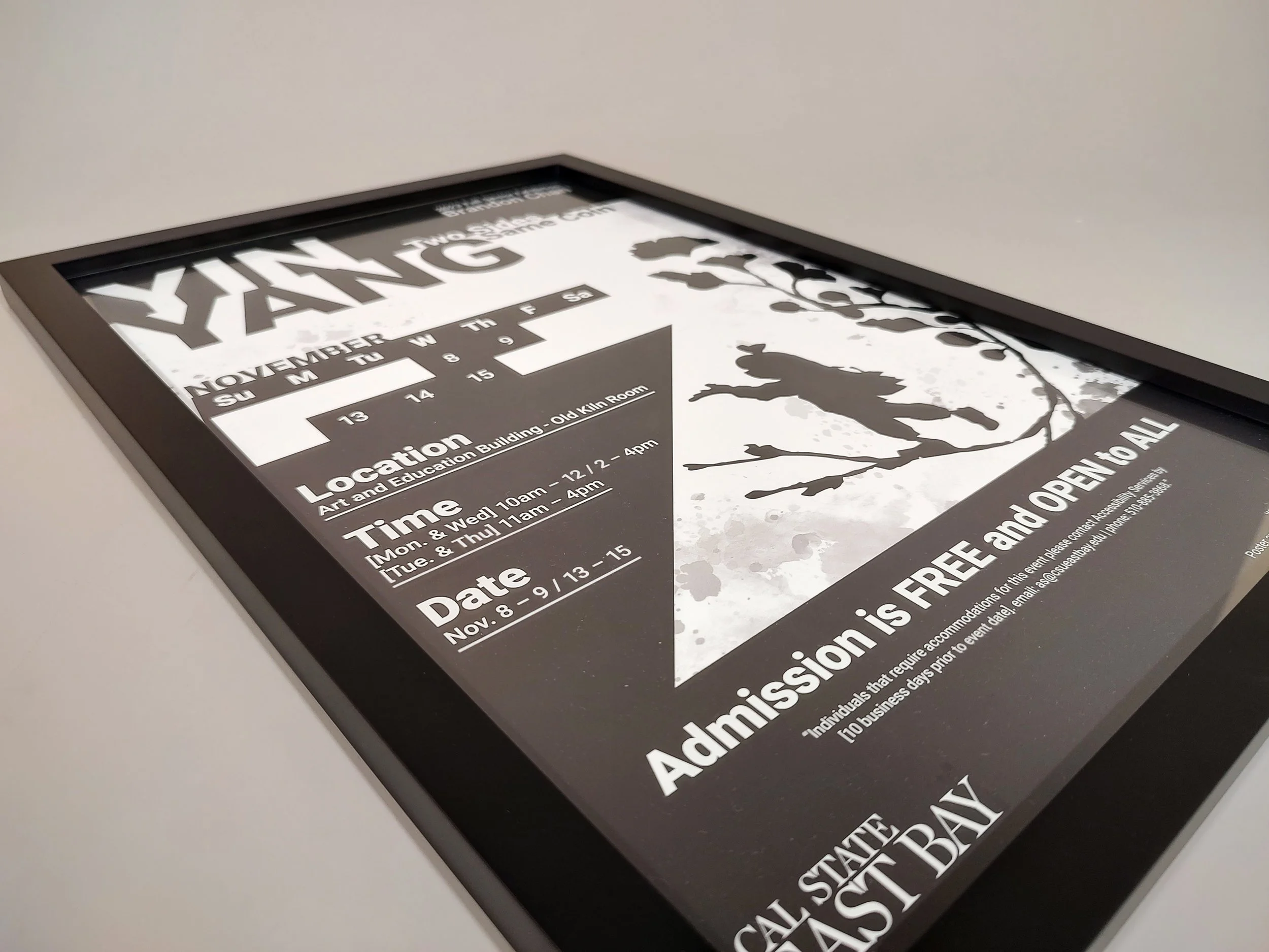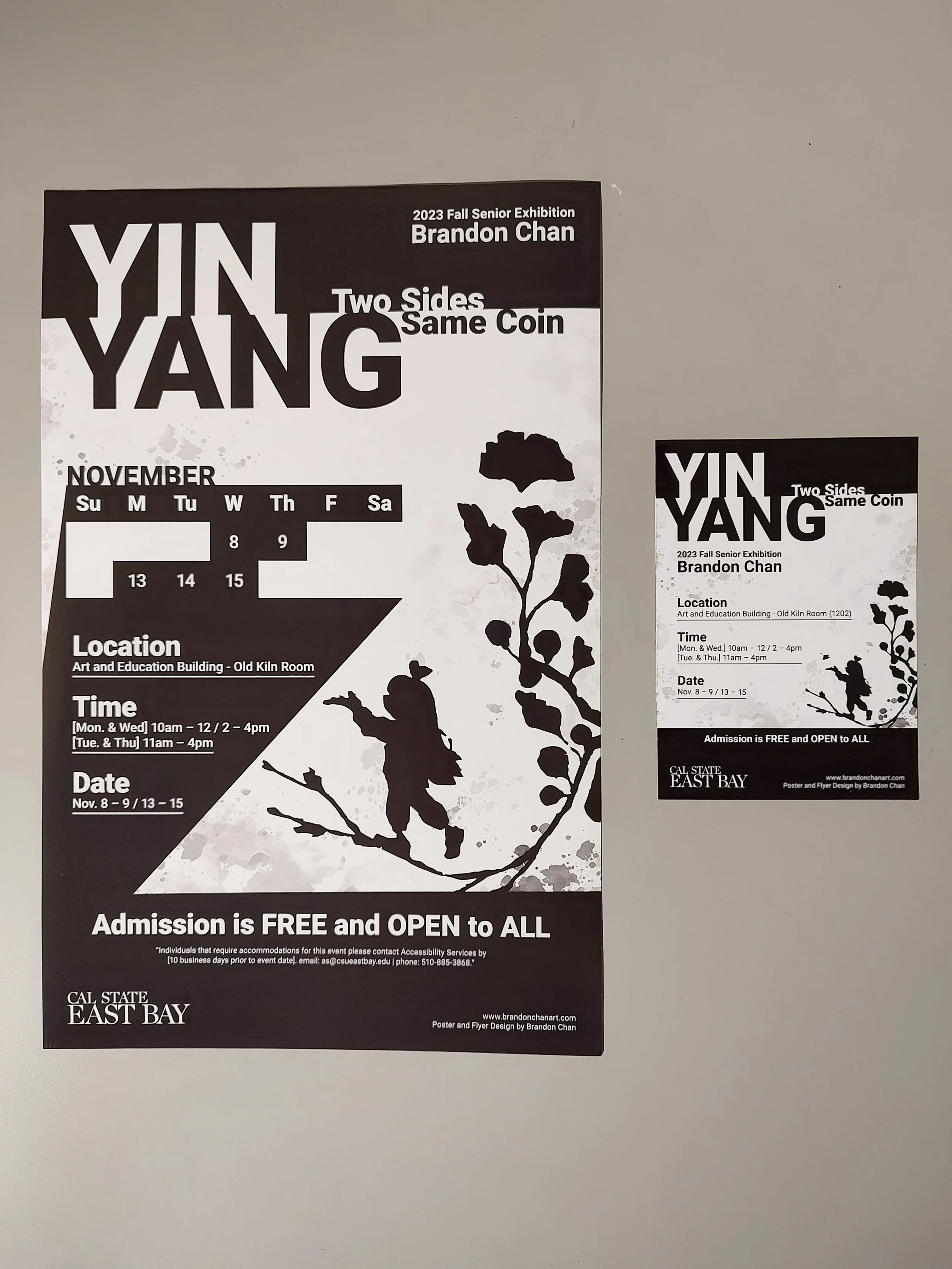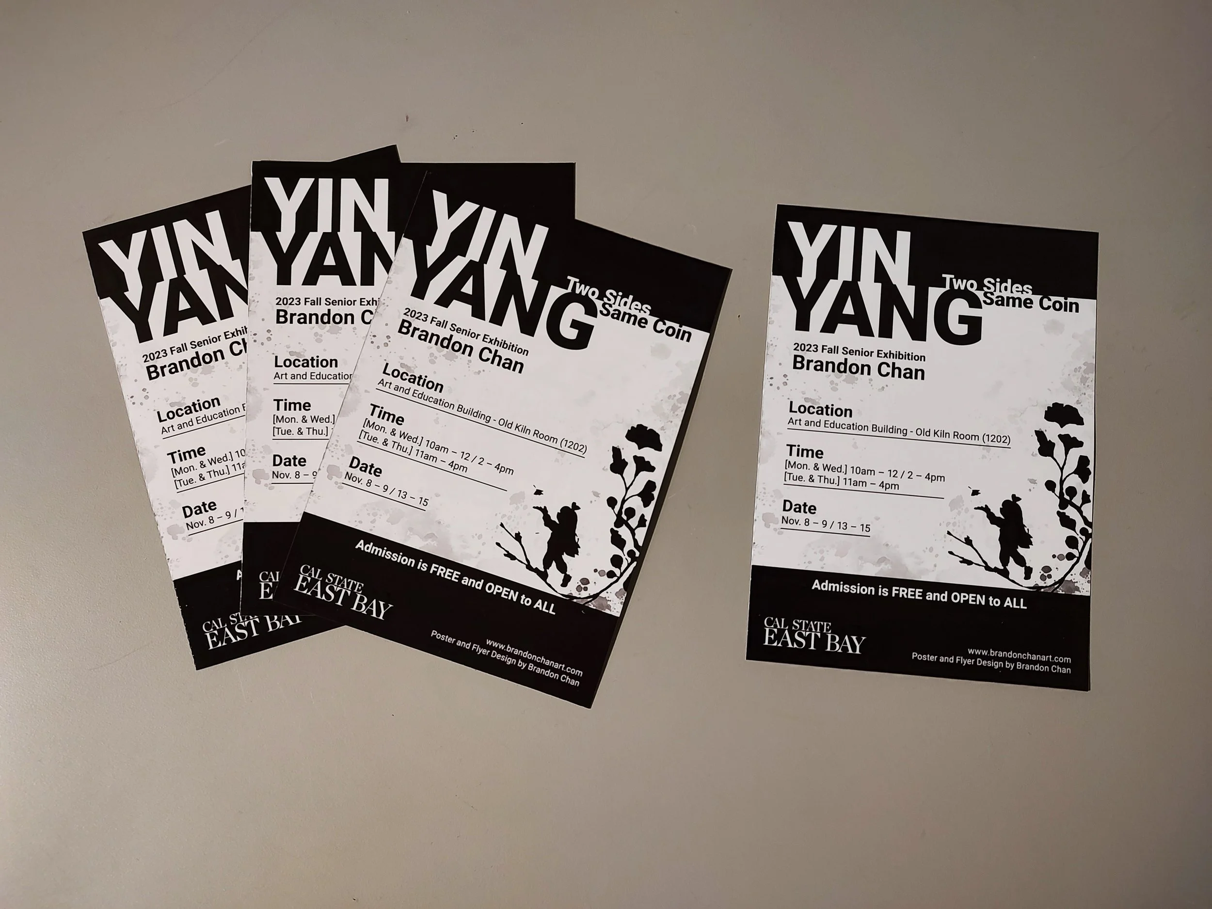 Yin Yang: Two Sides Same Coin was a student art exhibition that ran between the November 8th to November 15, 2023. The gallery exhibit presented a collection of thematic artworks produced by Brandon Chan as his fine art senior project. To promote the showing, Brandon created his own advertisement posters and flyers.